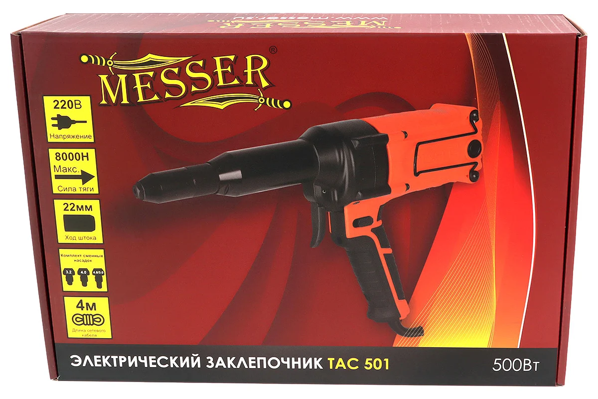 Электрический заклепочник Messer TAC 501 для установки вытяжных заклепок (3,0 – 5,0 мм) — обновлённая версия легендарной модели MESSER TAC 500.